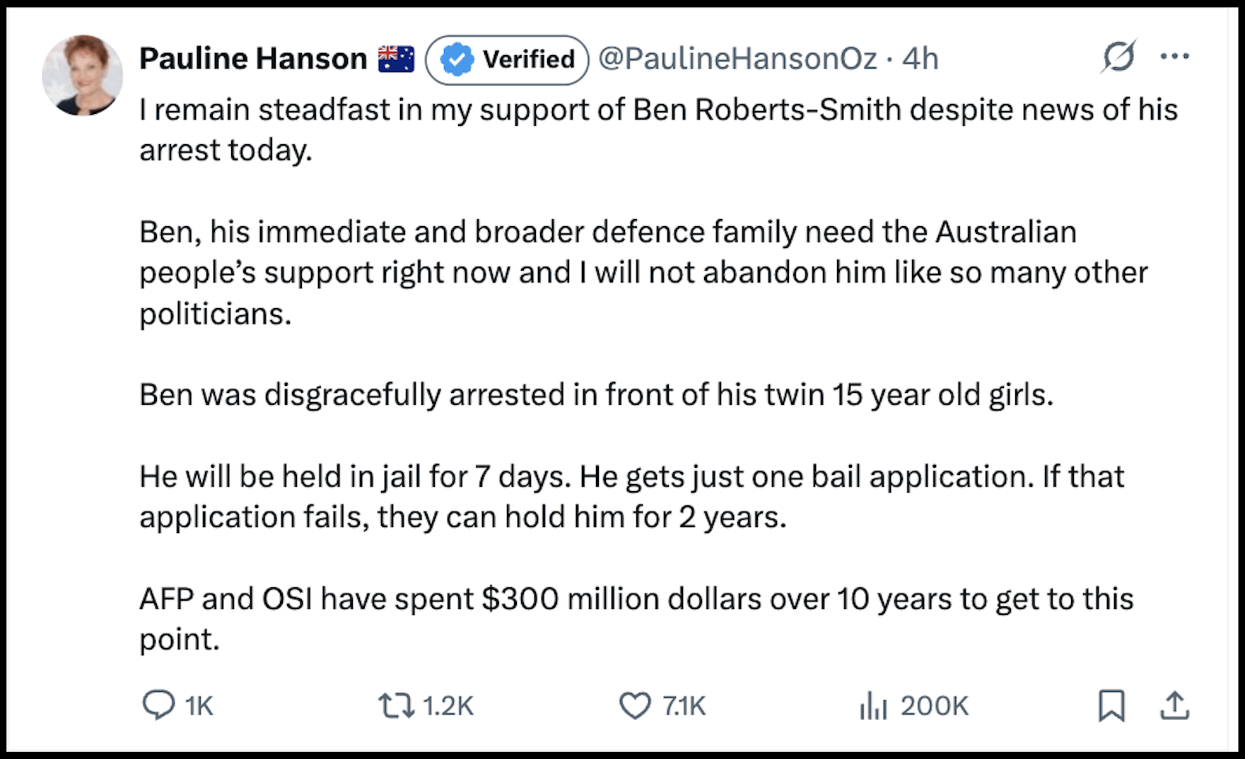 “I remain steadfast in my support of Ben Roberts-Smith despite news of his arrest today,” Hanson posted to Twitter/X this afternoon.