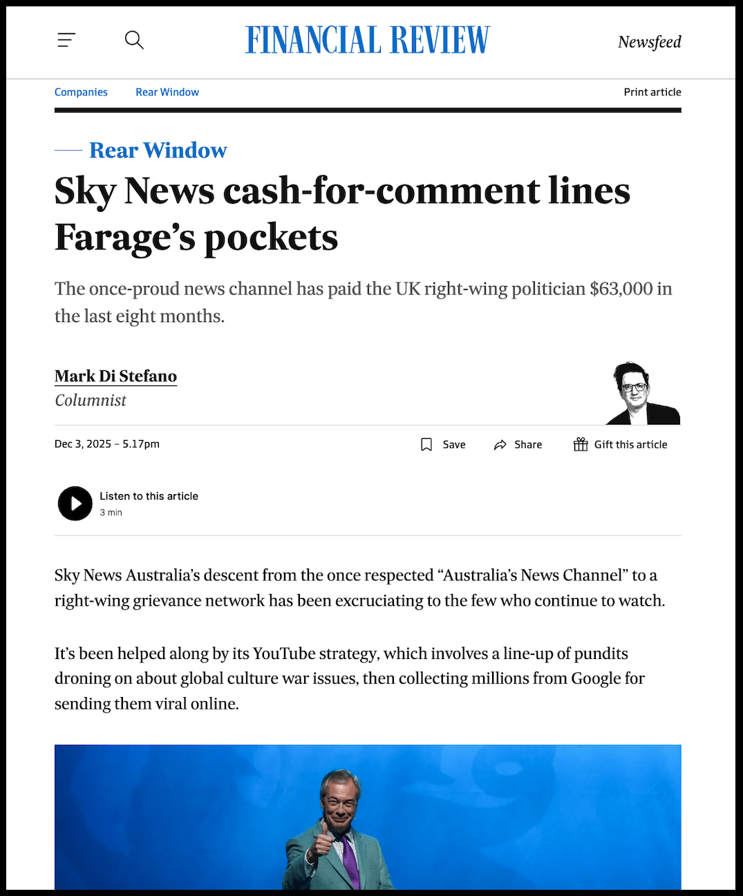 Sky News Australia’s descent “to a right-wing grievance network” has been “excruciating to the few who continue to watch”. Source: AFR