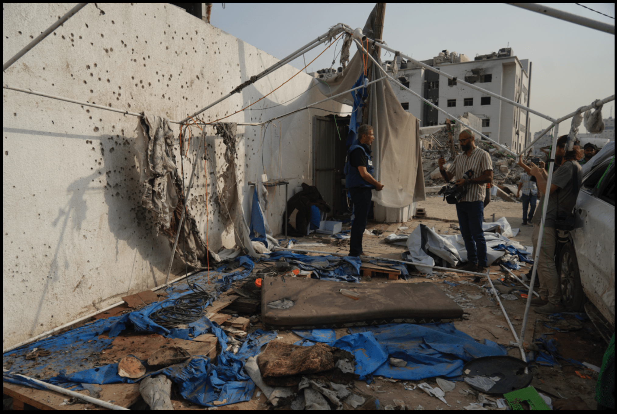 Palestinian journalists on Monday inspect the destroyed tent outside Gaza City’s Shifa hospital complex, where Al Jazeera correspondents Anas al-Sharif and Mohamed Qureiqa were killed, along with other journalists. Source: Jehad Alshrafi/AP