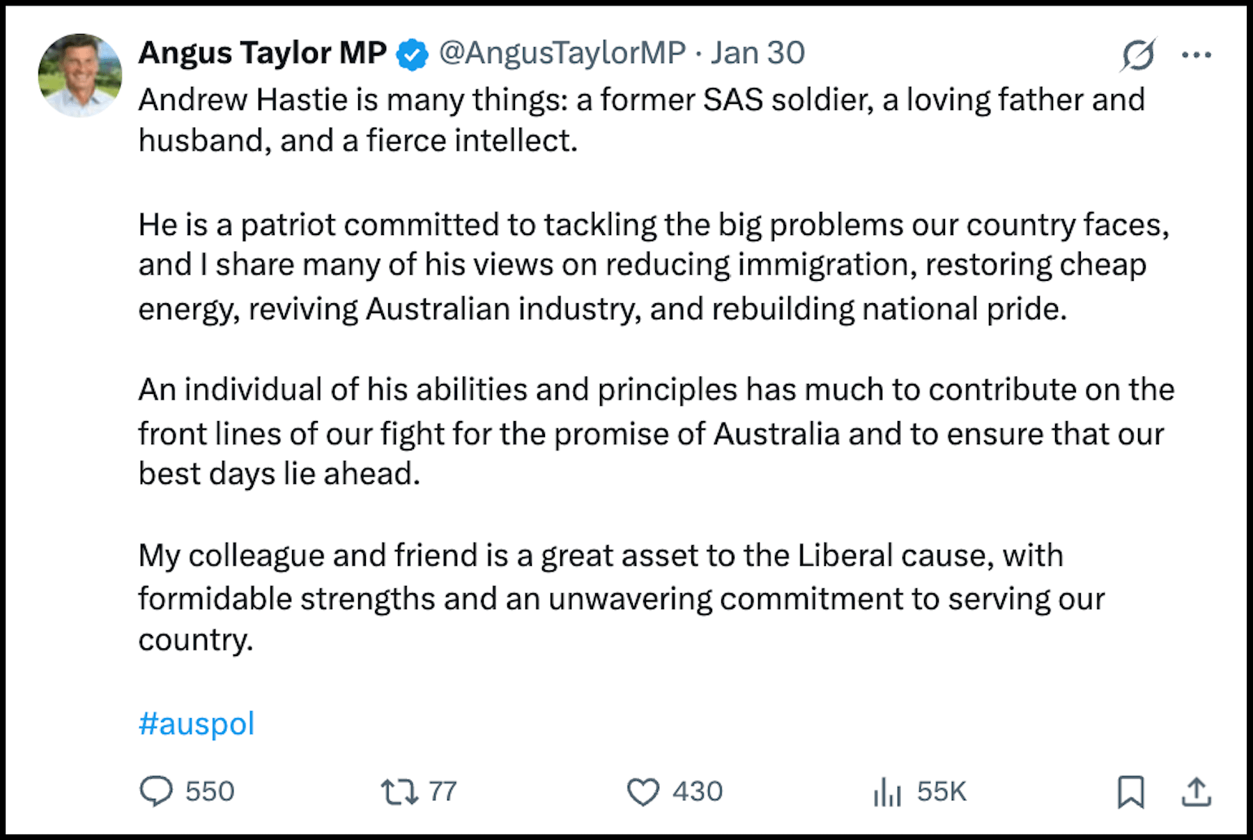 In a bid to appeal to Hastie supporters, Taylor has posted on social media that Hastie is “a patriot committed to tackling the big problems our country faces” and said he shared many of his views.