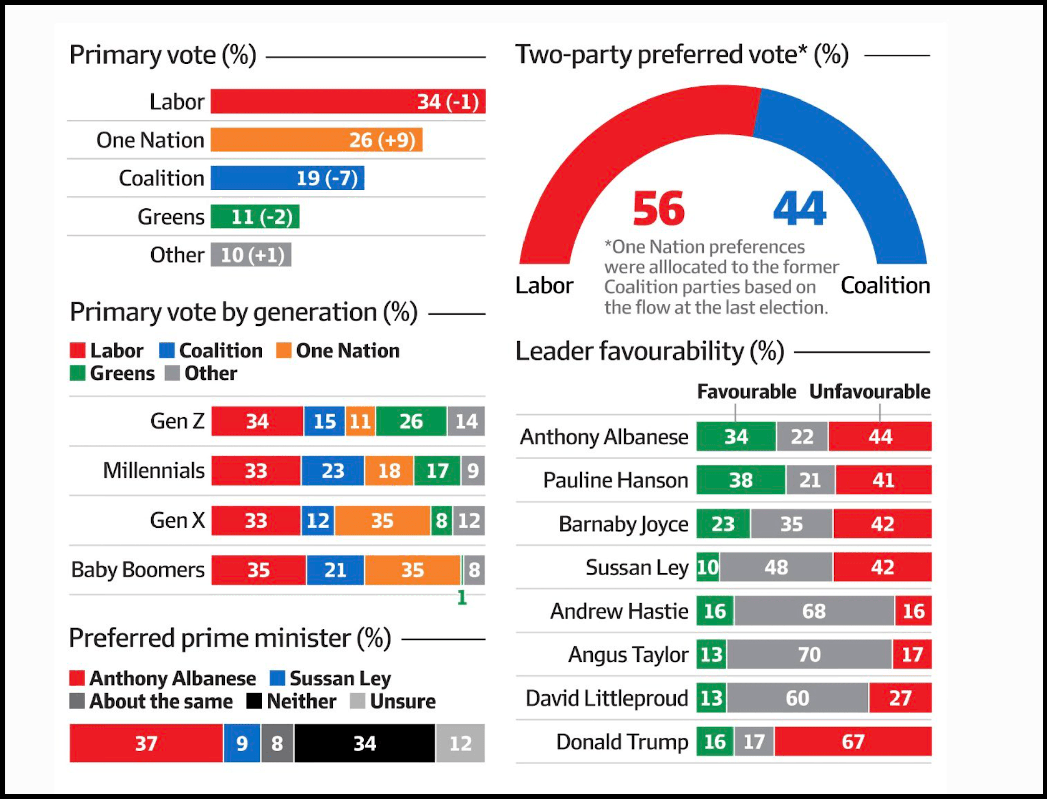 Ley’s net favourability is minus 32, a worsening of 12 points. Hanson’s net favourability has improved from minus 19 to minus 3.