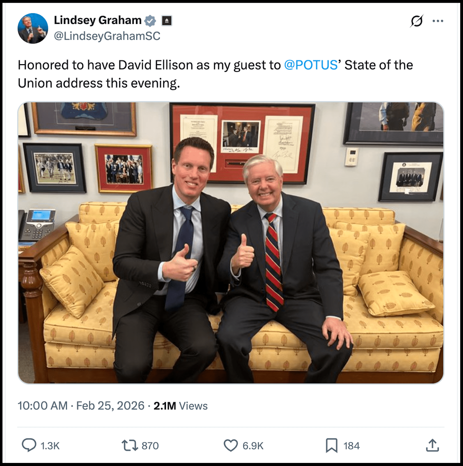 While Netflix was facing political opposition, David Ellison was Republican stalwart Lindsey Graham’s guest at Trump’s State of the Union address. Thus, WBD shareholders were assured the Paramount deal had Trump’s tacit approval.
