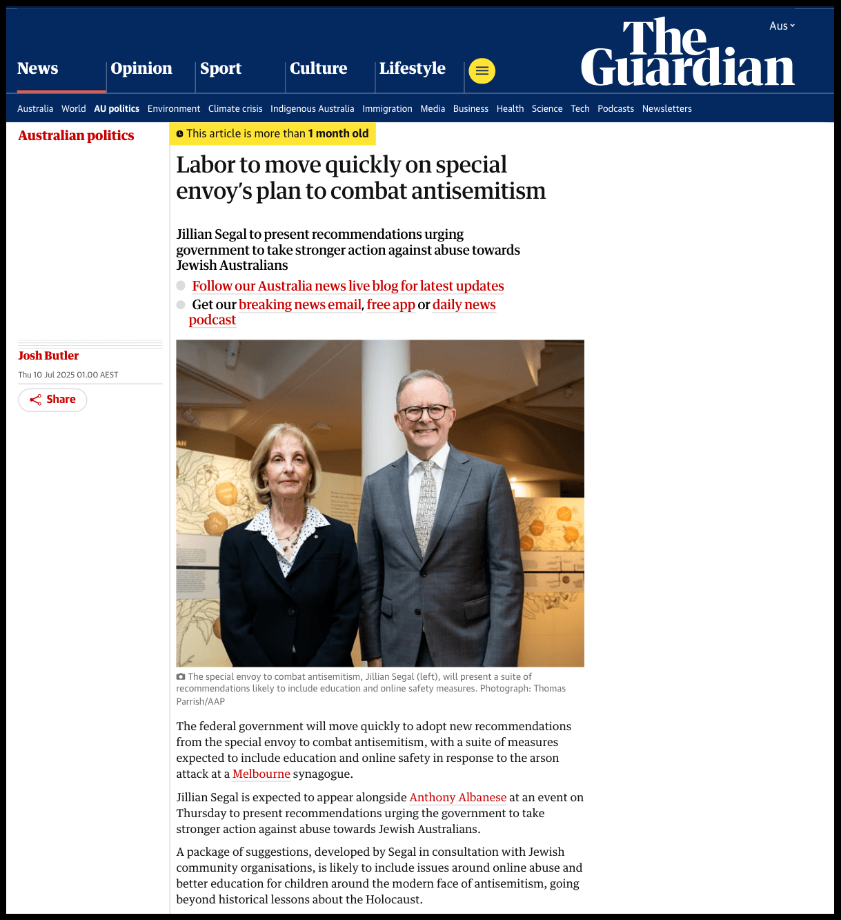 On July 10 Guardian Australia reported the “federal government will move quickly to adopt new recommendations from the special envoy to combat antisemitism,” citing Labor sources.