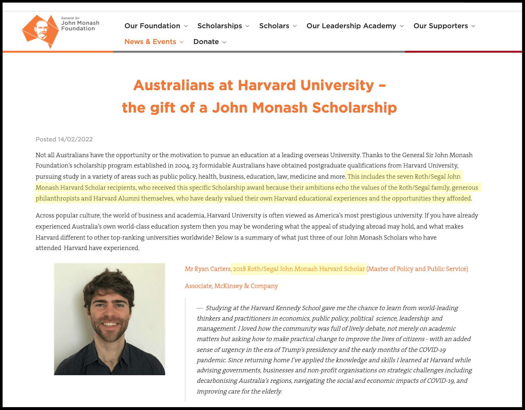 Investigations show Segal and Roth have been awarding the Roth-Segal John Monash Harvard Scholarship, to the prestigious Harvard University in the US, for a decade.