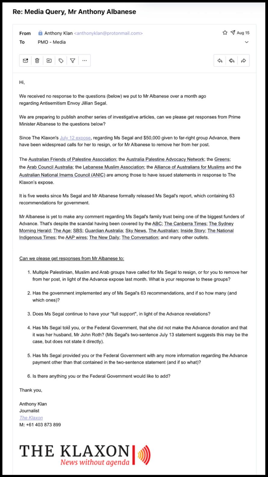 Responding to The Klaxon’s expose, on July 14, Home Affairs Minister Tony Bourke told the Sydney Morning Herald “Advance is an appalling organisation” and “those who fund it are not acting in the cause of social cohesion”.