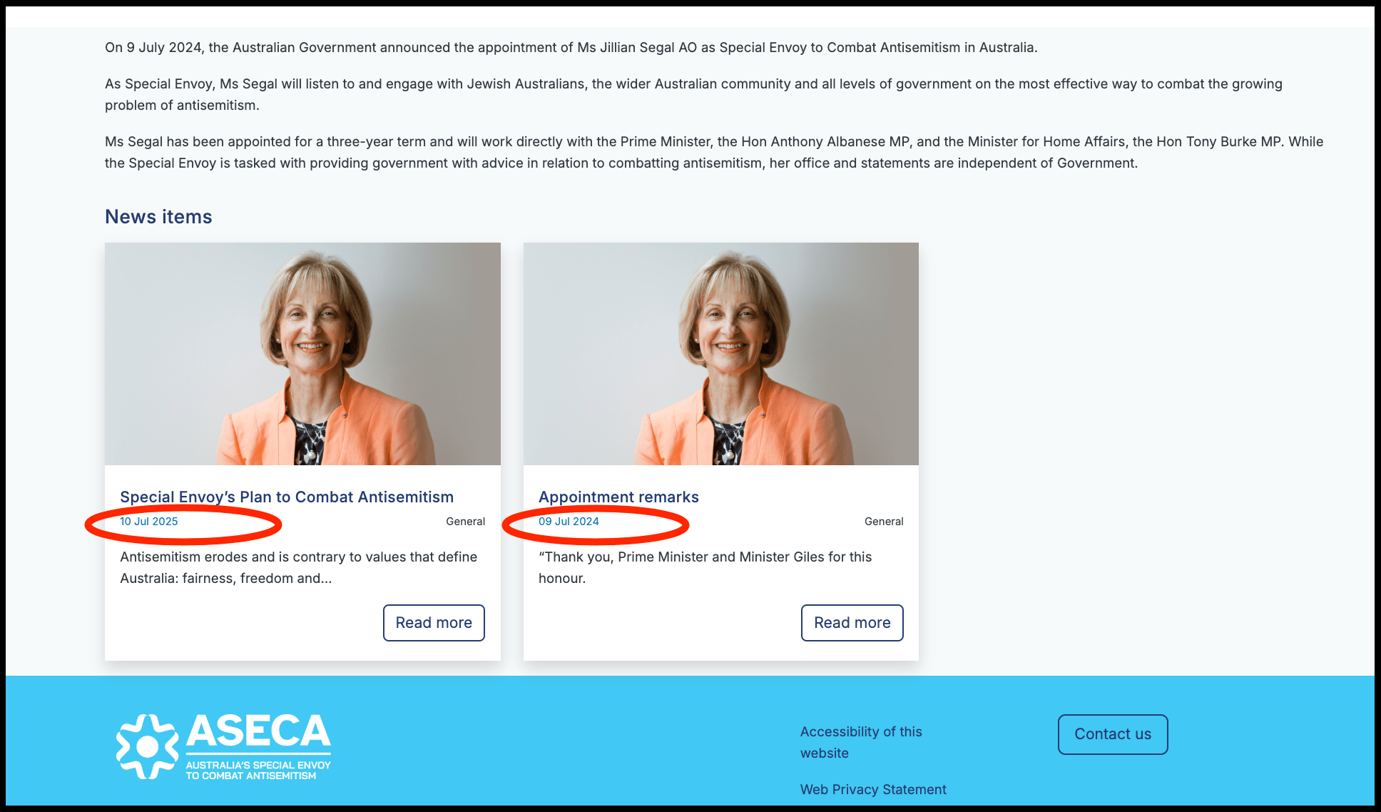 The most recent update to the “latest news” section of Segal’s “Australia’s Special Envoy to Combat Antisemitism” website was in November last year.