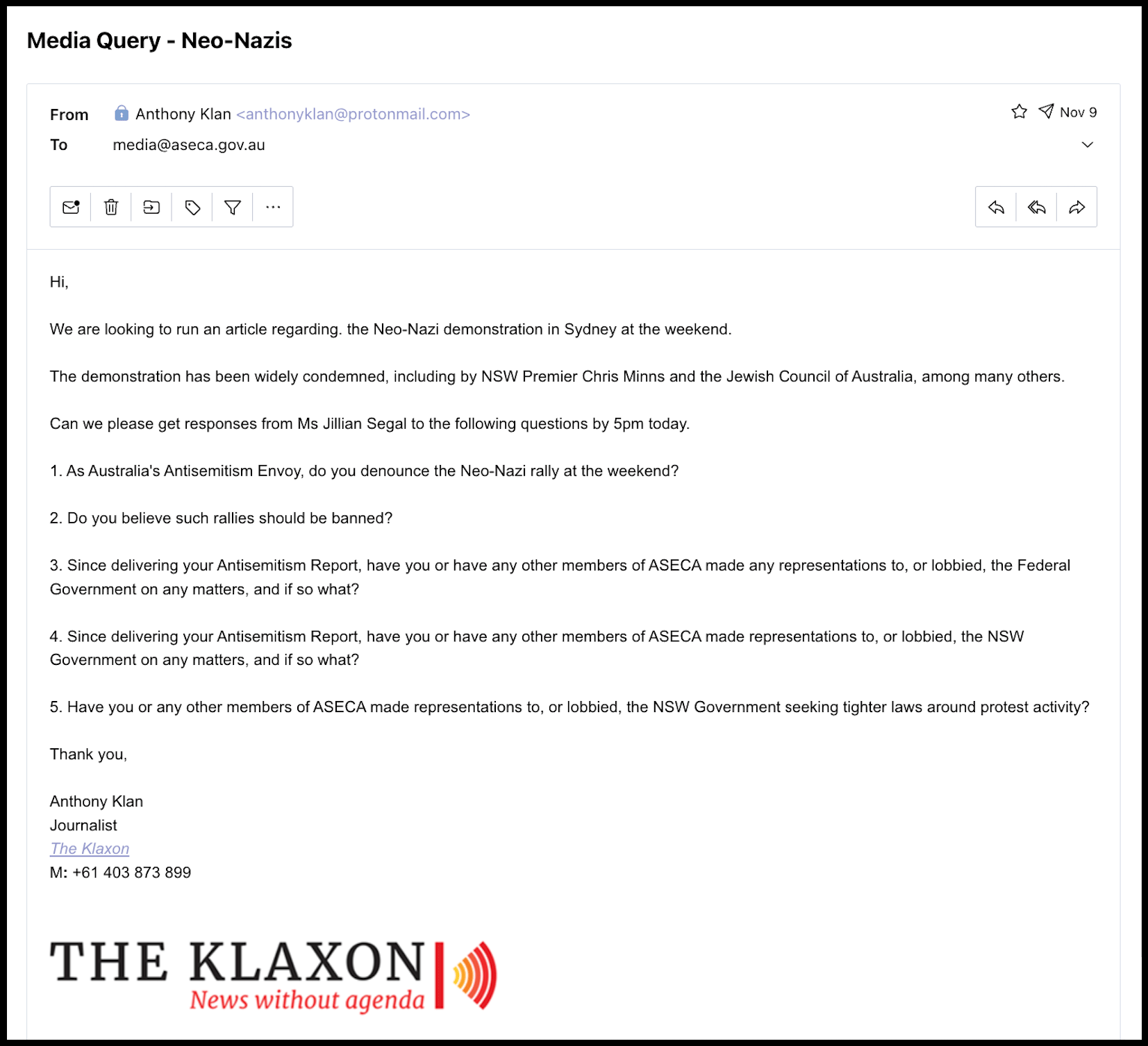 As previously revealed by The Klaxon, Segal is — and has been at all times since her appointment — a current top official of pro-Israel lobby group, the Executive Council of Australian Jewry (ECAJ).